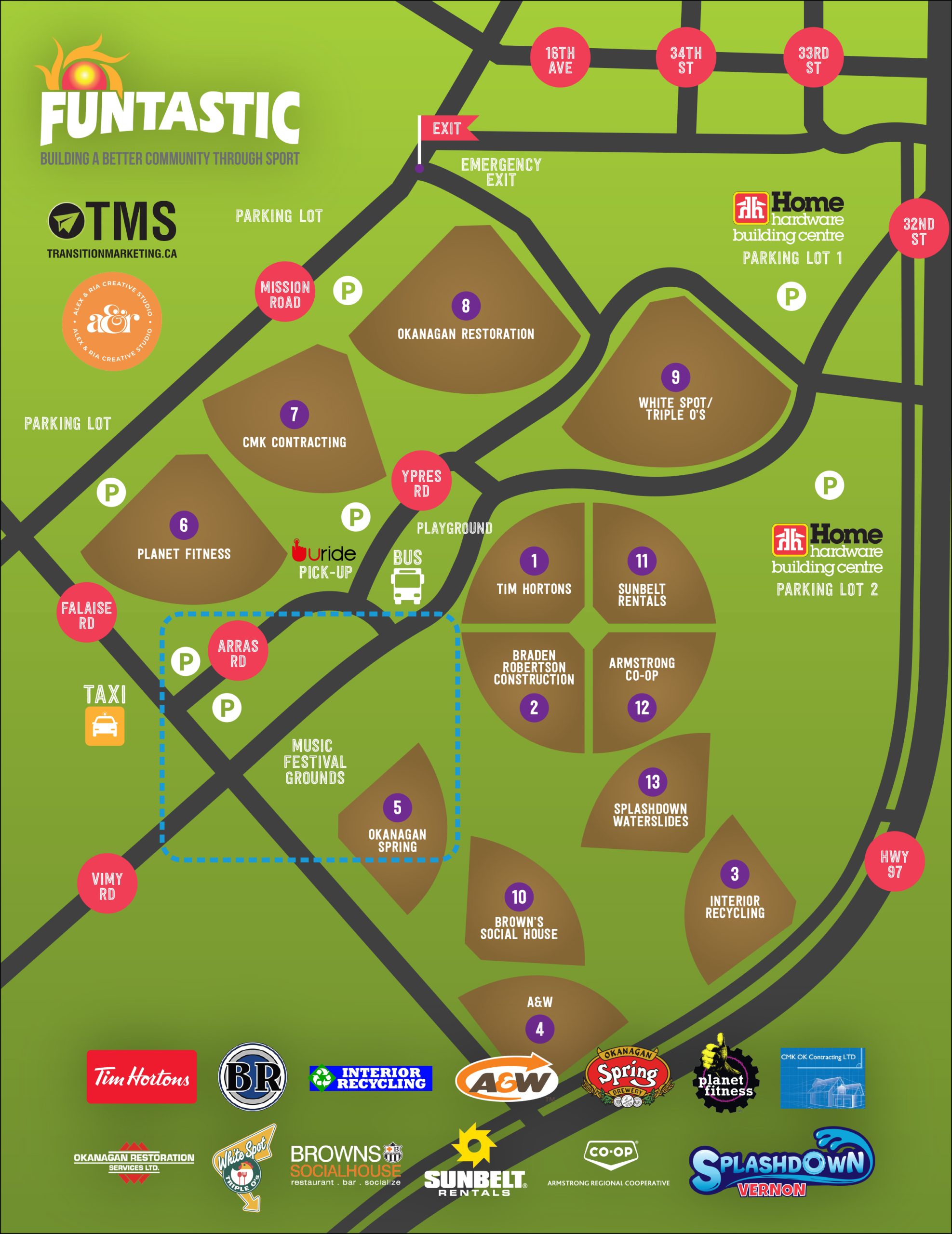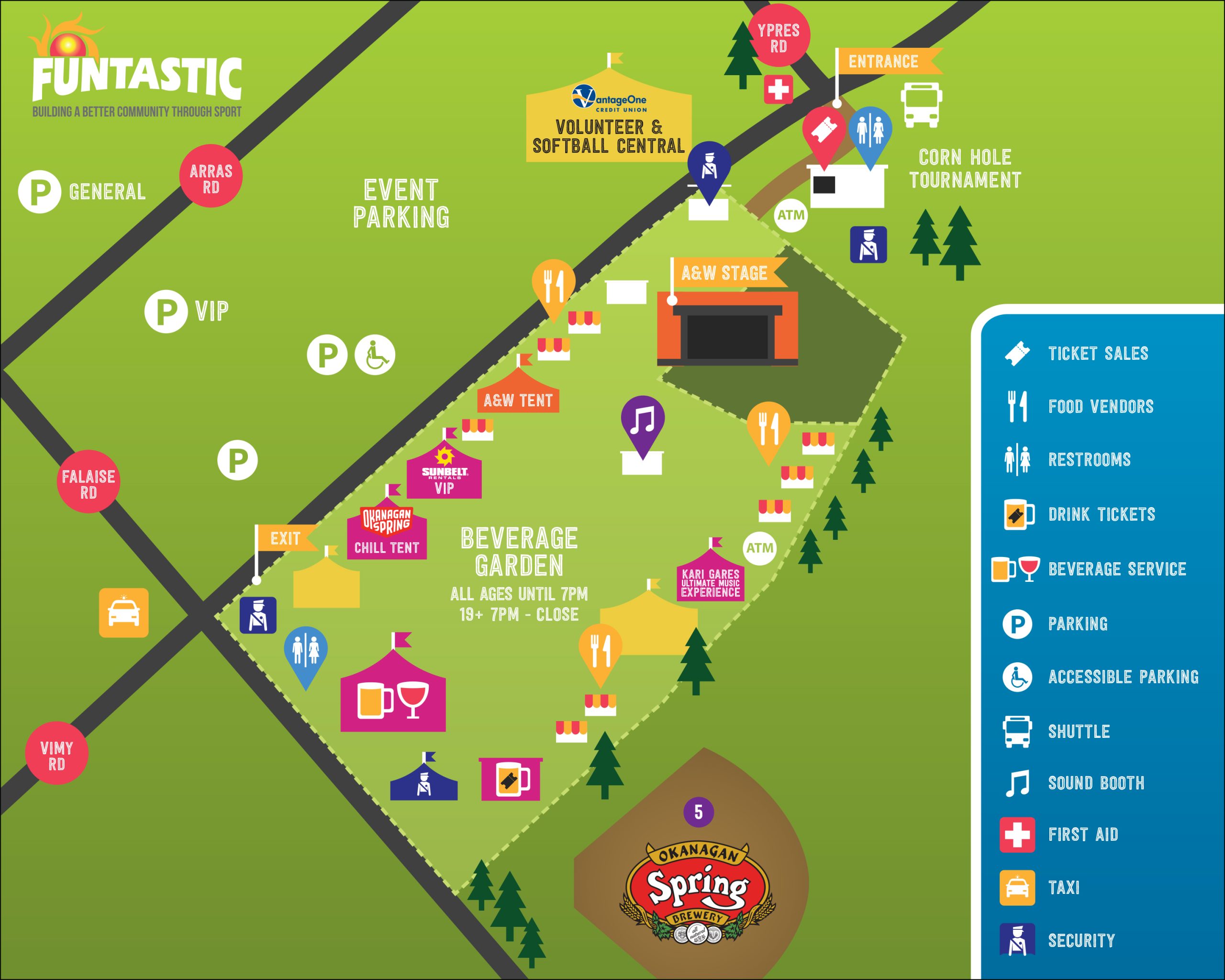 The Funtastic Festival & Slo-Pitch Tournament takes place at the DND Sports Grounds in the beautiful city of Vernon, BC, where the diamonds, music, and festival energy all come together in one central hub. Follow the site maps for both the Slo-Pitch Tournament grounds and the A&W Music Festival and beverage gardens, making it easy to find your field, food carts, catch your favourite bands, and get from first pitch to first encore with ease.
